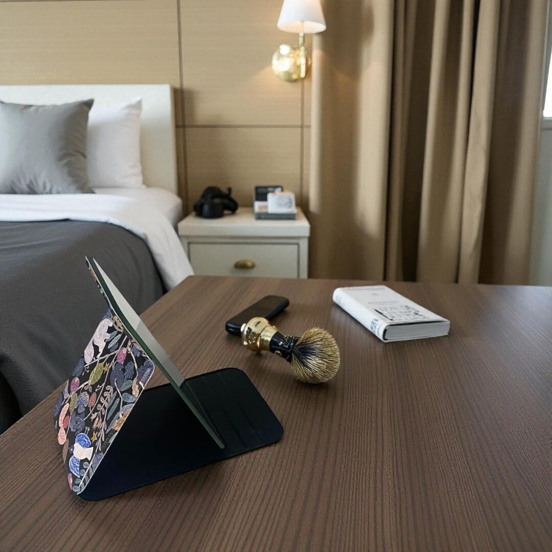 薄くて軽い。外でも家でも使いやすい、やさしい絵柄のスタンドミラー。